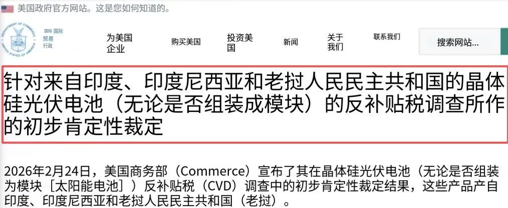 没错,就在2026年2月24日,美国商务部宣布:对来自印度、印尼和老挝的包括太阳能电池/面板等晶体硅光伏电池(无论是否组装成组件)作出初步肯定性反补贴税裁定,接下来将正式征收关税。