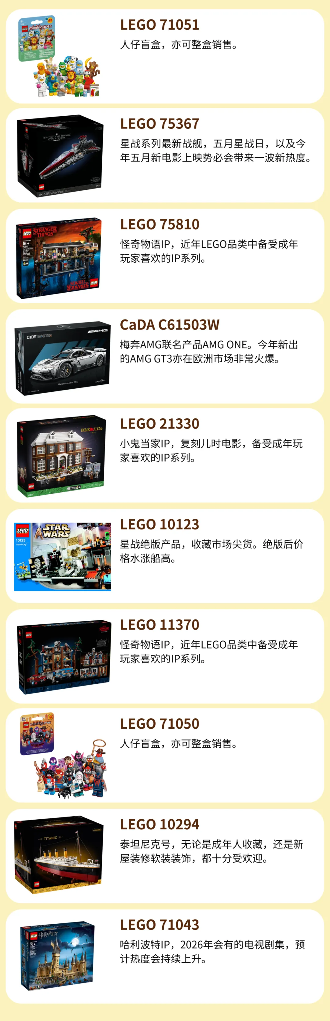 从整体来看,积木品类仍以IP驱动与收藏需求为核心,品牌集中度较高,其中LEGO依然占据主导地位。