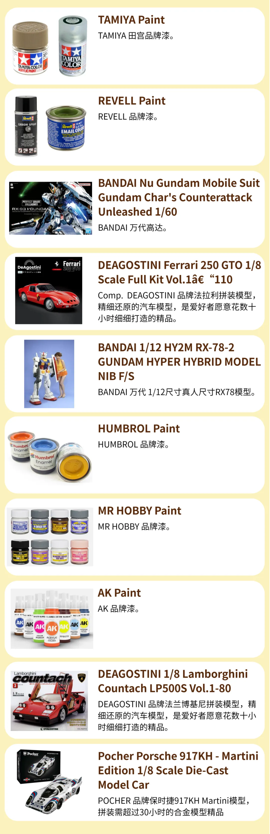从榜单来看,首先一骑绝尘于所有产品的,是我们“胶佬“(广东对塑料拼装模型爱好者的玩笑称呼)非常需要的工具之一-各式各样的漆。由于模型产品对动手能力DIY有很高的要求,买家需要对模型进行上色喷漆描边让其“活起来”,除此之外老牌的模型品牌(汽车类和军模类)和高达,是模型品类中销售超过80%的存在。