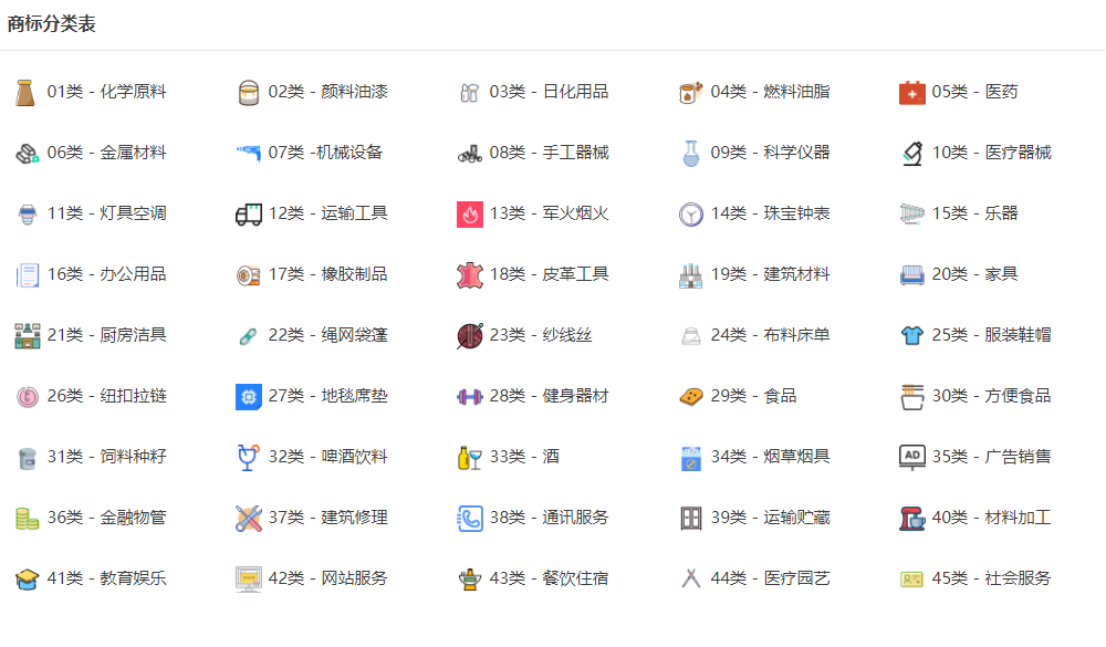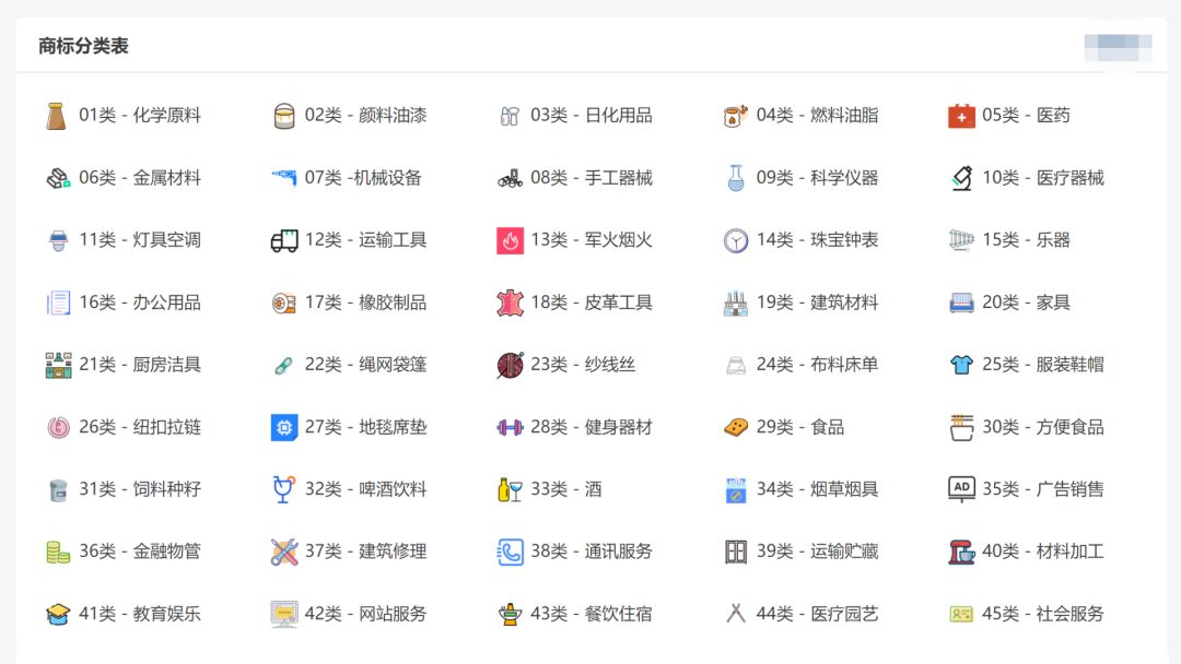 每个分类都对应着小清新式的图标logo,既满足了卖家们搜索的审美,又不失商标分类的特质。简单明了,方便卖家在对应的品类下进行查找。