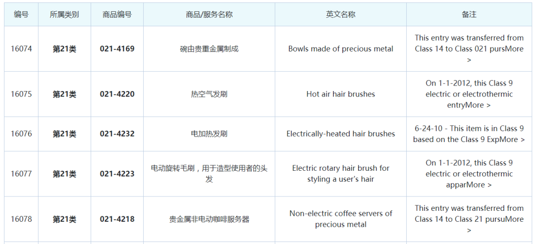 每个商标对应的类别、编号、商品的中英文名称和备注都一一对应,简洁明了。
