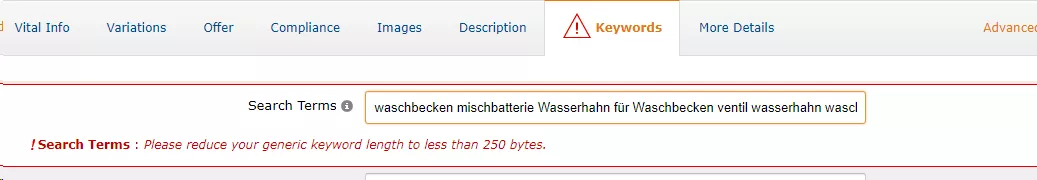 当你的Search terms填写过长时,系统会提示你不得超过250个字符,其中空格也算入250个字符长度限制。