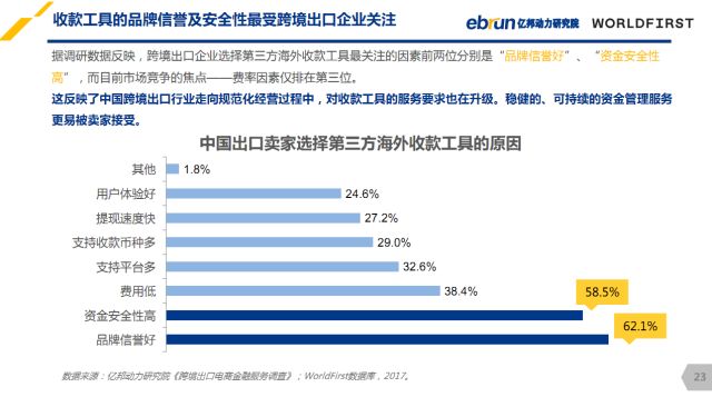 人生无论飞得多高,平稳着陆才是最重要的,钱也是这样。据《2017中国跨境出口电商金融服务白皮书》调研数据显示:跨境出口企业选择第三海外收款工具最关注的因素前两位是“品牌信誉好”及“资金安全性高”。 第三方平台如何保证资金安全呢 别急,我们先看一下资金的流动动向 简单来说就是 你的钱是怎么漂洋过海来看你的 划重点:海外本地支付对接服务商 国外监管机制与国内有差别,就如同国内的驾照不能到国外开车一样,国内的支付牌照同样也不能在国外使用,因此就会用到海外本地支付对接服务商。 钱这么重要的东西怎么能一而再再而三的转手呢!在选择第三方支付工具时当然要选择在海外有支付牌照的企业,监管制度让钱从一而终,方便我们随时追踪其动向。 WorldFirst在中国香港,美国48个州和英国各地等不同国家不同地区都持有支付牌照!注意,美国等国家因各州自治,所以政策不同,监管制度也不同,需要不同的支付牌照。 划重点:做强者不能靠走偏路 剧中常有因侥幸而获得成功的人,但现实生活只有脚踏实地的强者才值得信任。 WorldFirst拥有大数据系统及强智能AI,选择合作的对象都是巴克莱、花旗、德意志等监管机制完备的世界知名银行,从资料审核、获得当地政府许可、与各大银行达成合作等,每一个环节都是以确保资金安全为优先。 自2004年WorldFirst成立至今,已经为12万家客户安全转账超过650亿英镑。14年来跨境电商从青涩走向成熟,我们初心未改,脚踏实地做好每一个环节,确保每一笔资金的安全和高效流转。 一蹴而就往往伴随着侥幸或是走偏,钱这么重要的东西当然要交给对的人。确认过眼神,你遇上脚踏实地的第三方收款公司,没错,就是WorldFirst!
