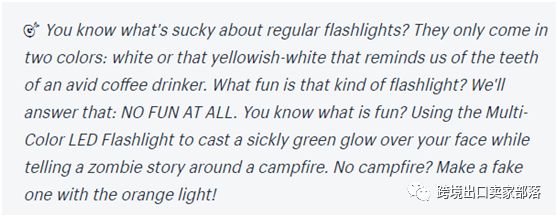 你可以学学他们,在写自己的产品描述时,先试想目标买家欣赏什么样的幽默措辞、讨厌什么词,他们是否能接受“ sucky”、“ crappy”(糟糕的)这类词,以及他们会问你什么问题。