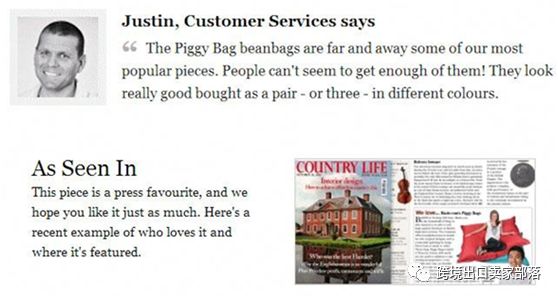 Made.com添加的客服人员照片增加了产品描述的可信度,让它的形象更具个性化。而且,新闻截图进一步证明了其产品的热度。