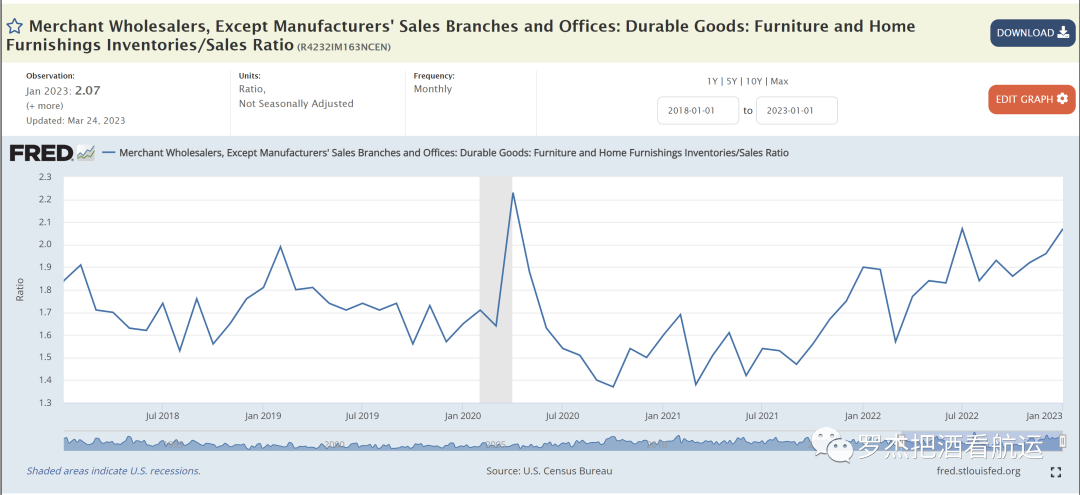 尽管如此,总的库存水平还是在高位。今年1月份的建材和园艺工具类的库销比是1.96,远高于2020年2月的1.7。疫情期间美国家庭“折腾”自己家(remodelling, 加建,修葺,重装等等)的热度终于过去了。家具的库销比还在1.9,也比三年前的1.58高出很多。下图是家具家居用品批发商的库销比,今年1月份是2.07, 2020年1月份则是1.65,说明批发商的仓库里还压了很多货。因为装修,在家办公、在家上学而添置的各种家具短时间内不会重复购买。