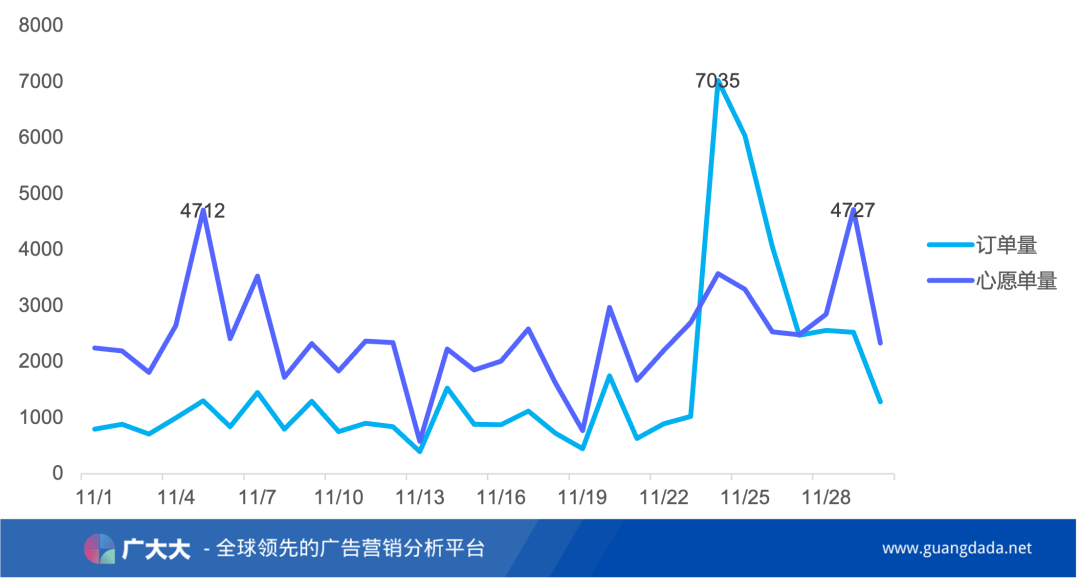 市场表现走势 ![]() 数据解读:该产品在11月初的销量走势及心愿单走势整体维稳,双十一活动前后销量有小幅上涨,而真正的销量释放集中在月底,受黑五及圣诞临近双重刺激,月底该商品最高日销量上涨至7k+,同时心愿单数量月底依旧维持在4k左右高位,可见12月初该商品需求仍将有所保持。在圣诞节日加成下,该商品需求虽然可观 | |