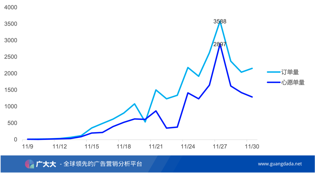 市场表现走势 ![]() 数据解读:该产品在11月初的销量走势及心愿单走势呈现明显上涨趋势,由于盲盒产品具有较强的礼品属性,加之年底感恩、圣诞等节日密集,导致该商品在黑五前后销量激增,日销量最高达到3588单,但是考虑到促销节日过后商品心愿单数量持续走低,预计该商品短期内热度增长将放缓。 | |