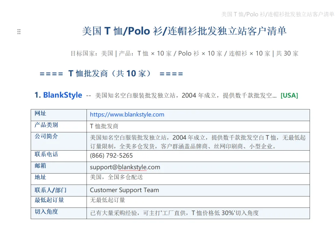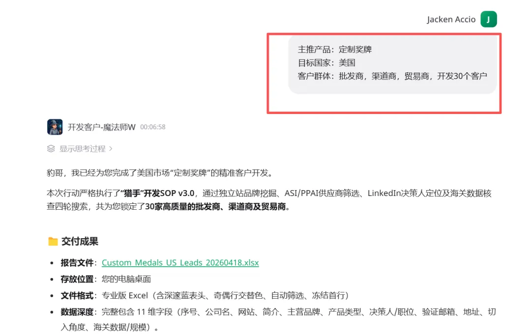 直接发它主推产品,目标国家,客户群体,能直接给你生成完整客户开发清单: