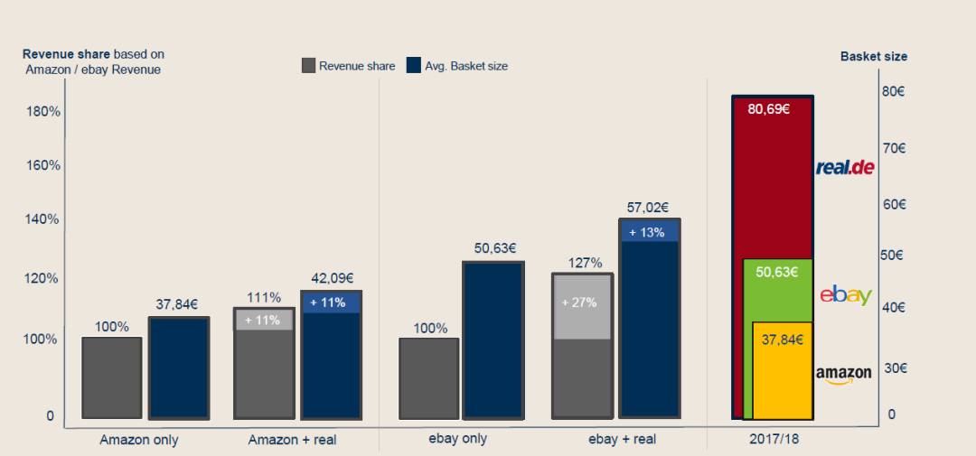 REAL.DE客单价居三大平台首位并且拥有更大的销售增长空间 平均价格为80欧元,高于EBAY的50欧、亚马逊的37欧元。
