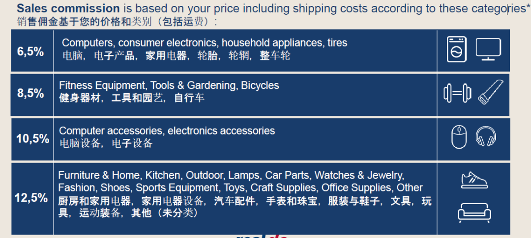 REAL.DE佣金合理,条件更优厚。可以在任何时候网上注册,月费39.95欧,无限制上传产品。主营类目佣金更低,低到6.5%。