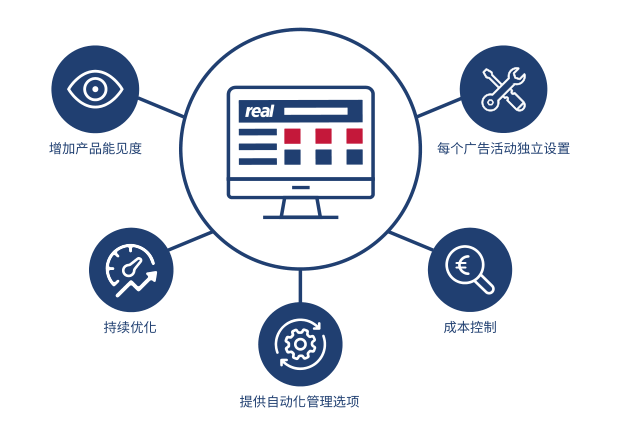另有Real.de全新的表现型广告工具透过显眼的广告展示位置提高产品能见度,准确地吸引正在寻找您的产品或类似产品的顾客,迅速增加总体销售额和长期收益!