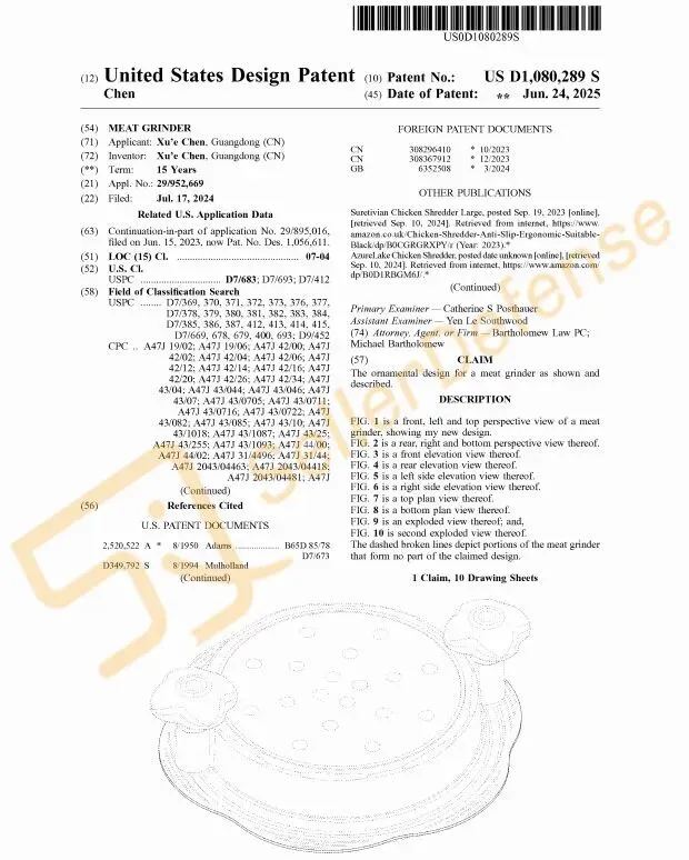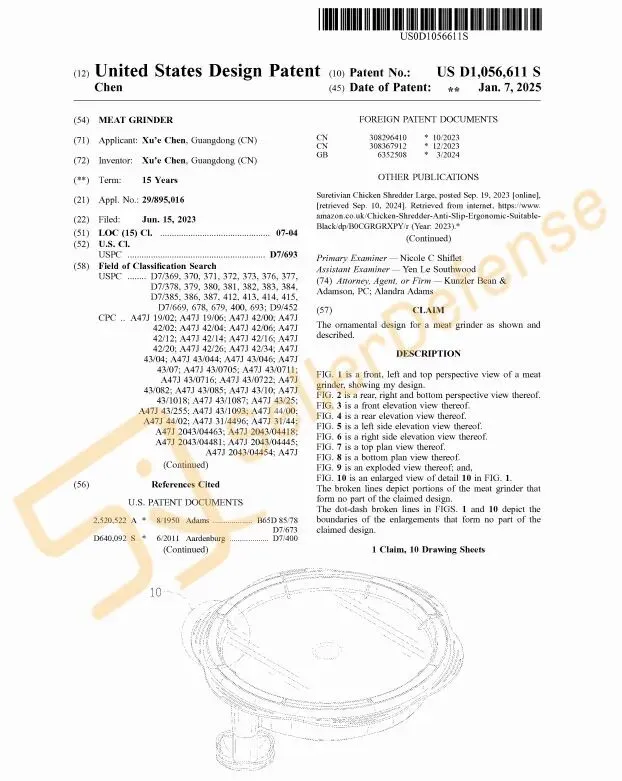 本案为国人原告,案件涉及专利是一款绞肉机。只需将熟肉放入绞肉机中,拉动手柄即可在几秒钟内轻松将熟肉撕成细嫩的肉丝,非常适合制作玉米饼、三明治等。
