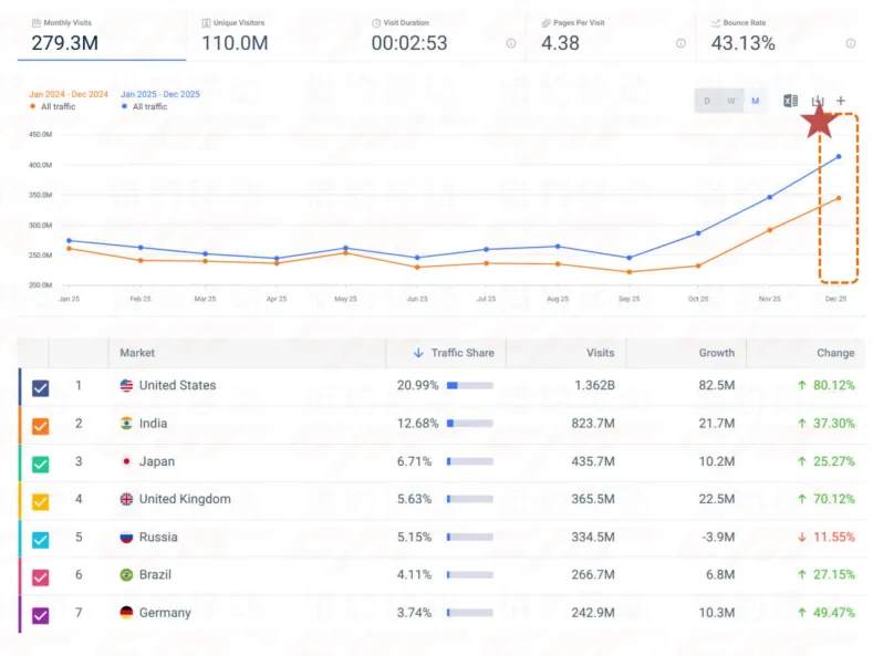 头部品牌访问量同比增幅集中在 20%–65% 区间