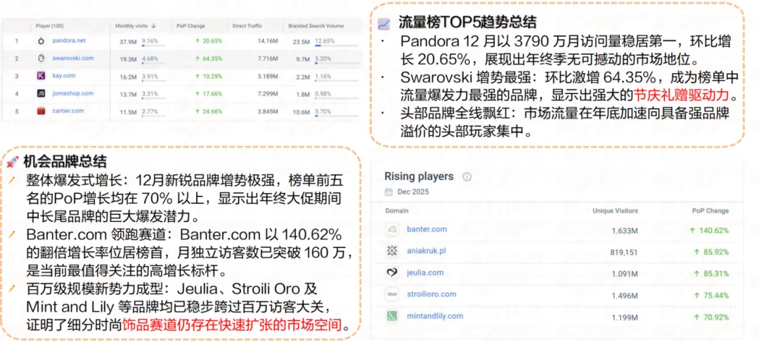 头部品牌(Pandora、Swarovski)维持规模优势,但中长尾品牌在节点期仍有爆发空间。