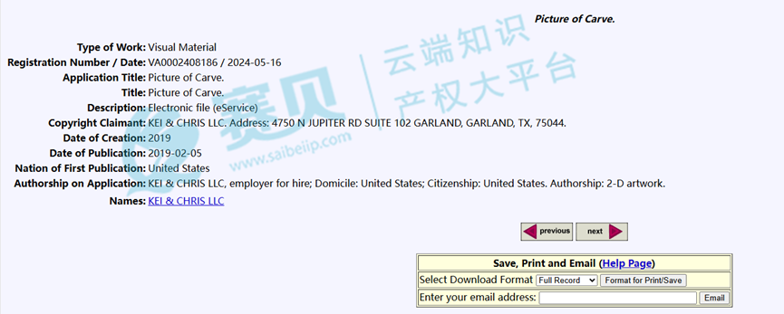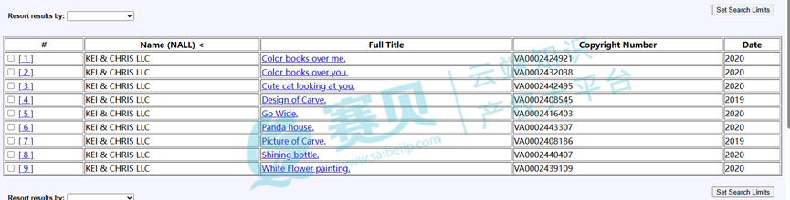 本次案件涉及的具体版权内容尚未对外公布,赛贝在经过细致检索后,初步推测该案件可能涉及VA 2-408-545、VA 2-408-186这两个版权编号的作品。赛贝还进一步深入查找,发现原告在2019年和2020年期间,陆续注册了多个版权,相关版权具体信息如下: