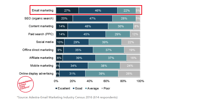 近四分之三(73%)的公司认为电子邮件营销对投资回报率来说是“优秀”或“好”的,一次成功的营销可以做到产品再现,品牌再现,深入人心。