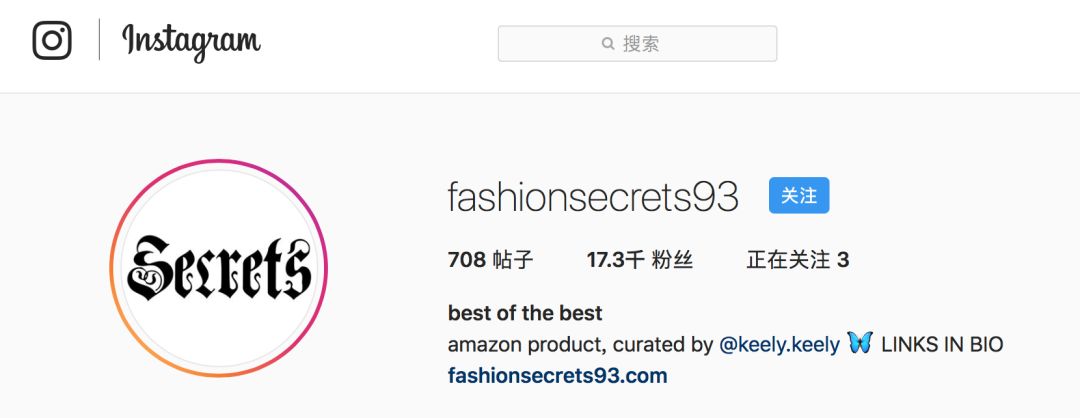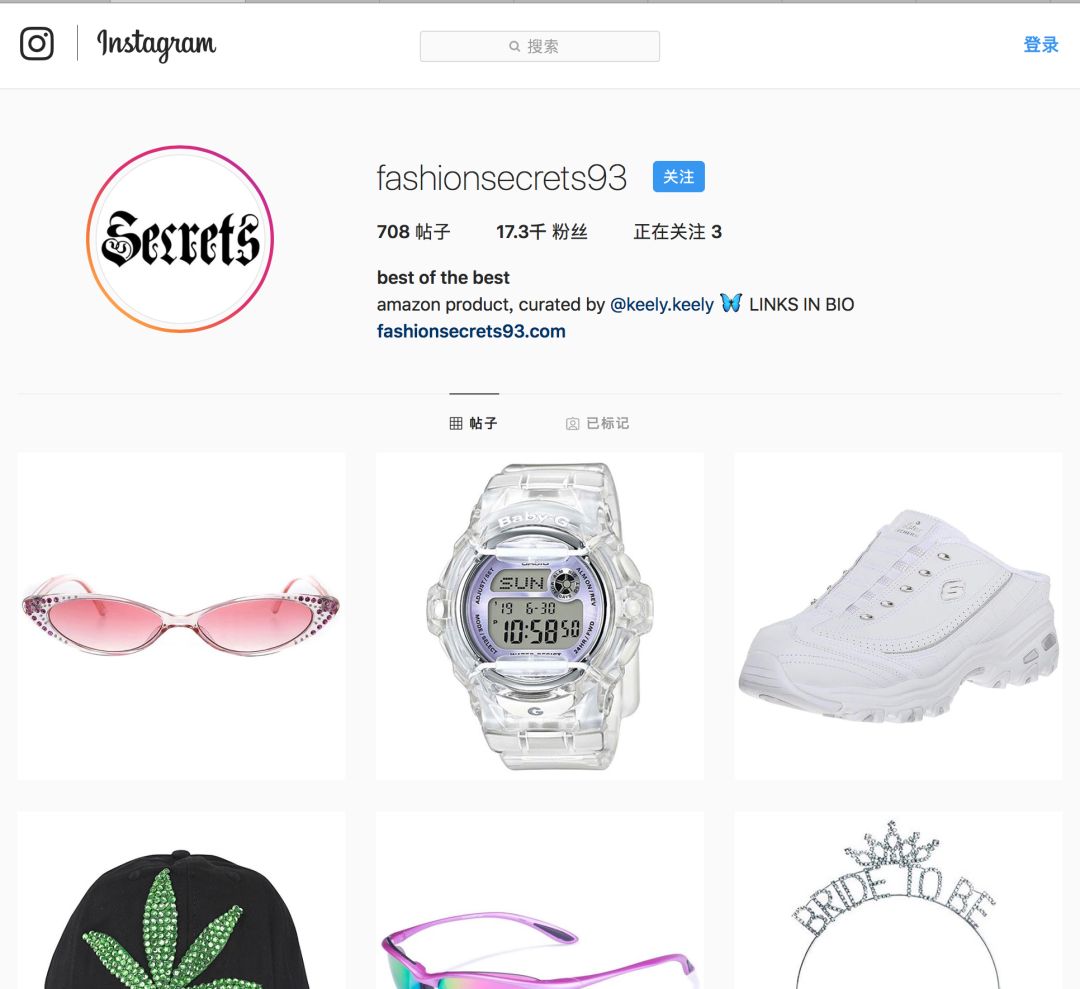大家可以通过手机端Instagram的应用或者Instagram.com搜索“fashionsecrets93”这个账户。不得不说,这个账户看起来很普通,首先粉丝数不多(但是被亚马逊选上应该也算精准),其次,产品图片非常平淡,一致的亚马逊风格——白底产品占图片,而且没有做产品标签。