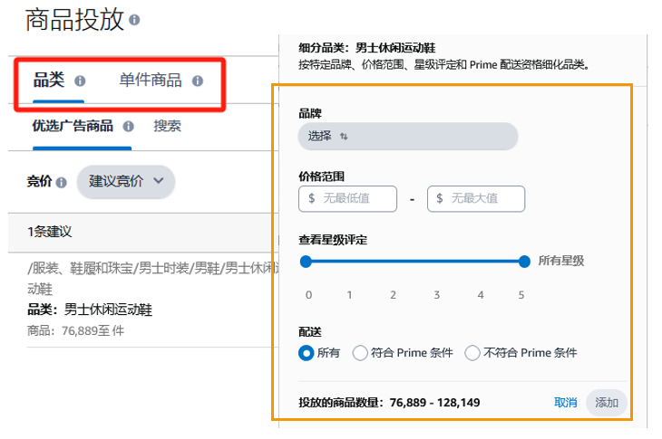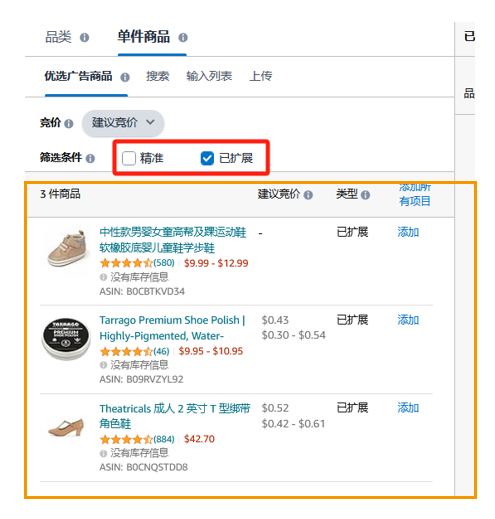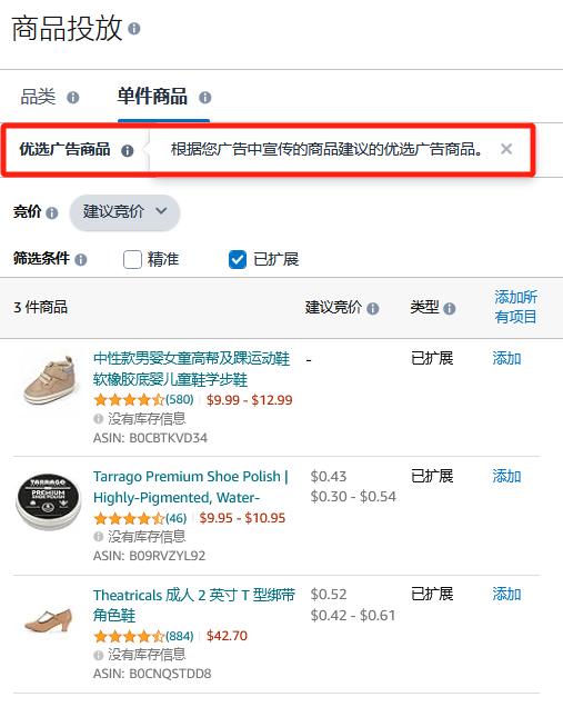 系统建议的商品/品类:创建广告过程中,亚马逊广告平台自动根据商品来推荐密切相关的商品或品类。