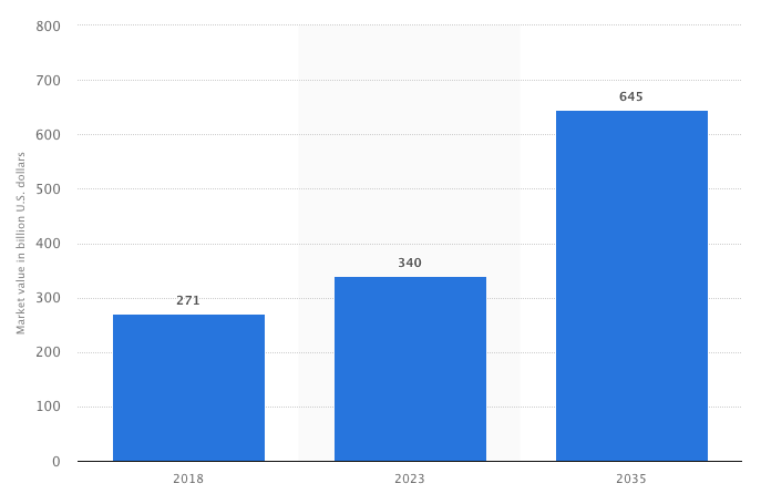 珠宝市场的价值预计将从2018年的约2710亿美元,增加到2035年的约6450亿美元。