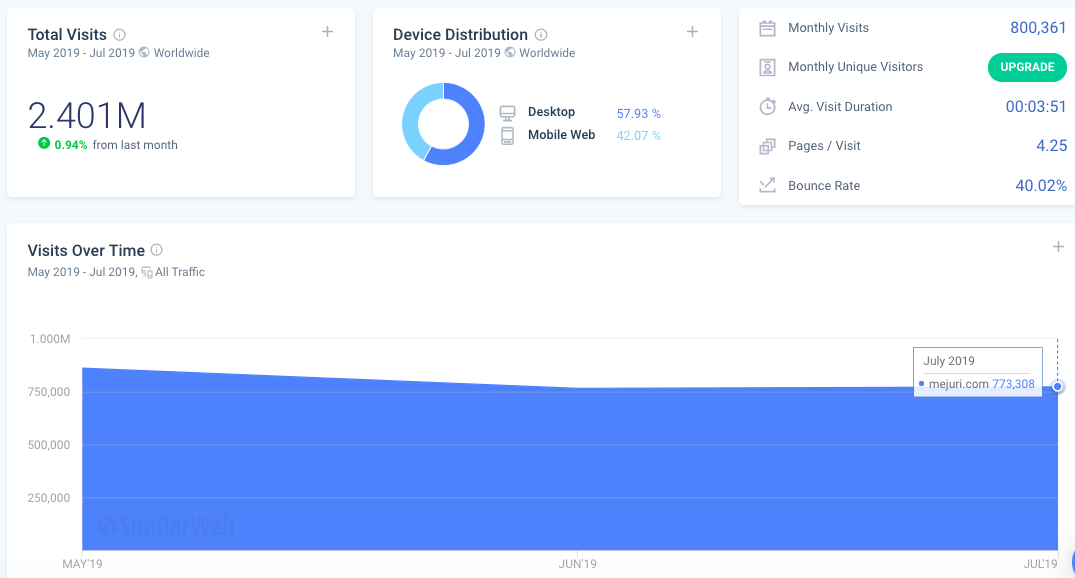该自营网站流量比较平稳,5-7月近三个月月均流量80万人次,平均浏览时间接近4分钟,平均浏览页面4.25页,跳出率为40.02%。流量主要来自桌面端占比57.93%。