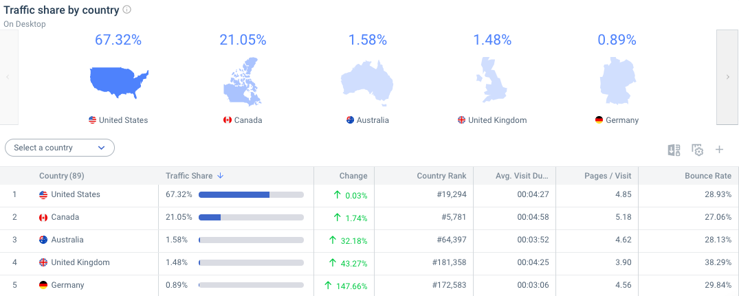 研究员观察到,该自营网站的浏览人数呈缓慢回升的趋势,来自全球89个国家,最多来自美国,占比67.32%。其次是加拿大、澳大利亚、英国、德国。值得一提的是,总流量人次排名前五的国家,近三个月都增幅明显。