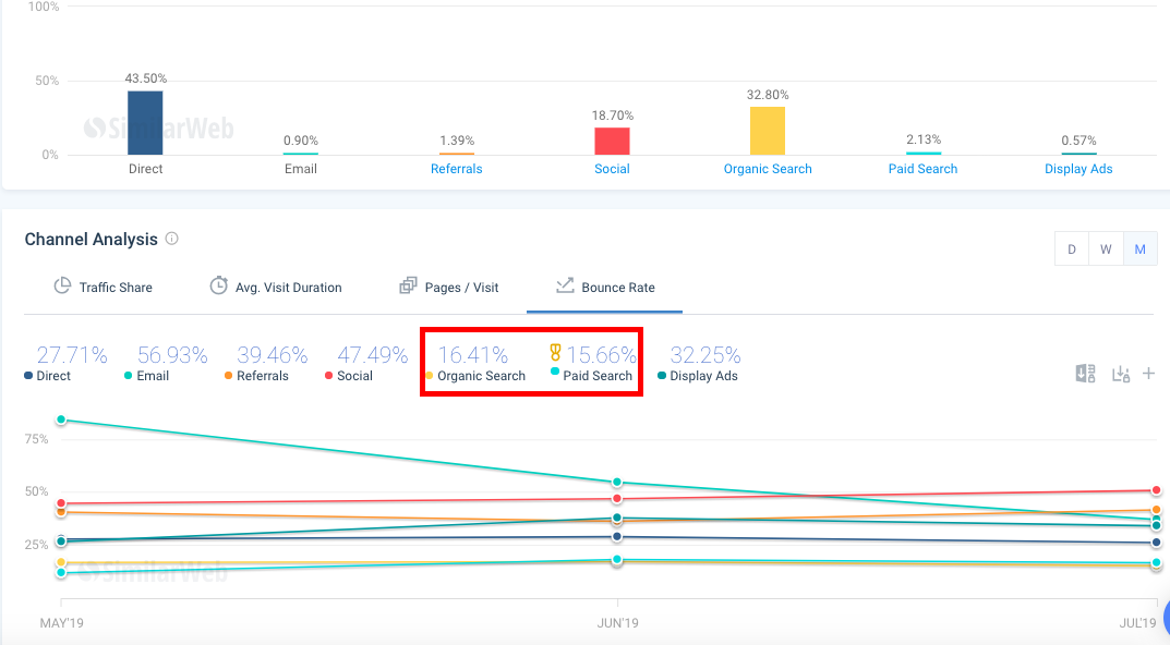 消费者一般是通过直接浏览或者通过搜索引擎浏览该自营网站。其中,通过直接浏览该网站的消费者最多,占43.50%。搜索引擎浏览该自营网站的消费者其次,占32.80%。且这两部分的流量跳出率都表现很好,是很健康的网站。