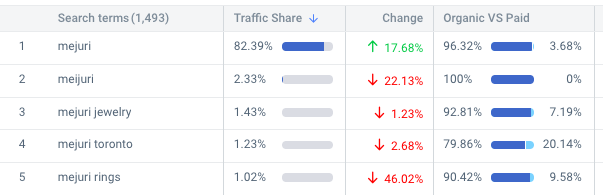 搜索部分的流量的表现很好,品牌知名度高,复购率高。从关键词看搜索,93.62%来自品牌词,自然搜索为主,总共布局1493个关键词,流量来源可以看到单一品牌词的压倒性占比82.39%,且仍在不断上升,品牌影响力已经打响。