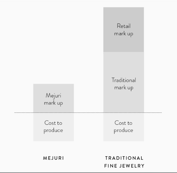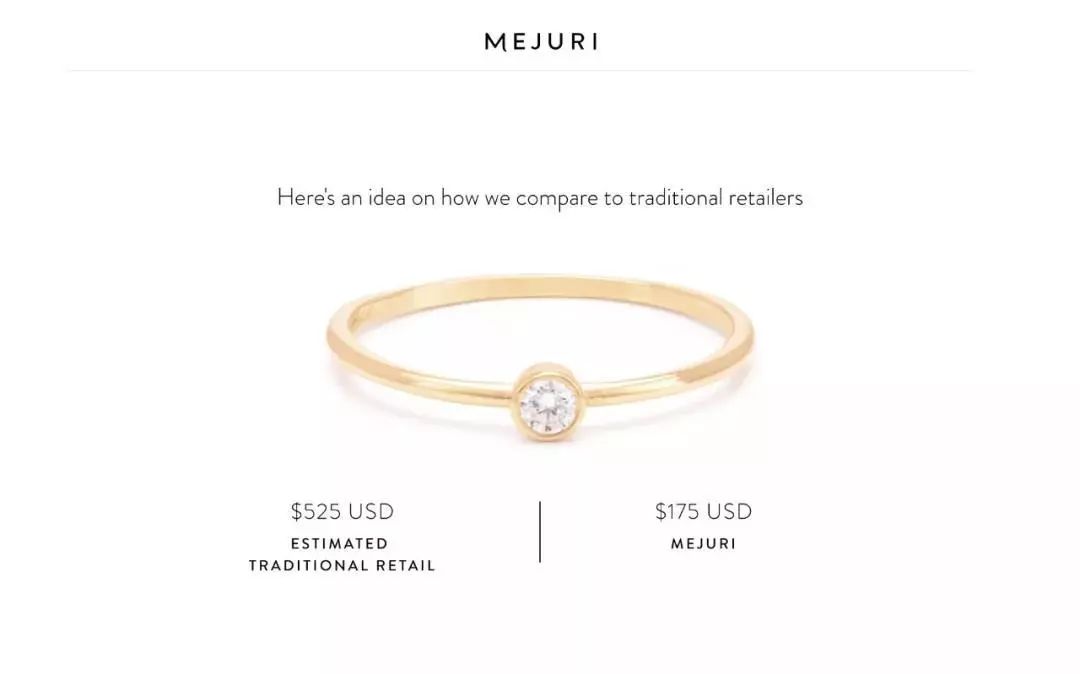 由于没有中间商赚取差价,消费者可以以极具性价比的价格买到高品质珠宝,传统品牌常以 525 美元的价格出售的戒指,Mejuri 的价格是 175 美元。