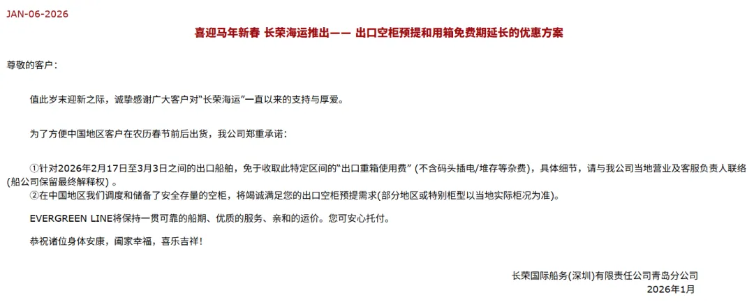 随着2026年春节临近,为保障节前出货高峰期的物流顺畅,长荣海运与ONE(海洋网联船务)已率先公布春节免用箱计划。长荣宣布在2月17日至3月3日期间,豁免出口重箱使用费,并已在中国地区提前调度空柜,以保障用箱需求。
