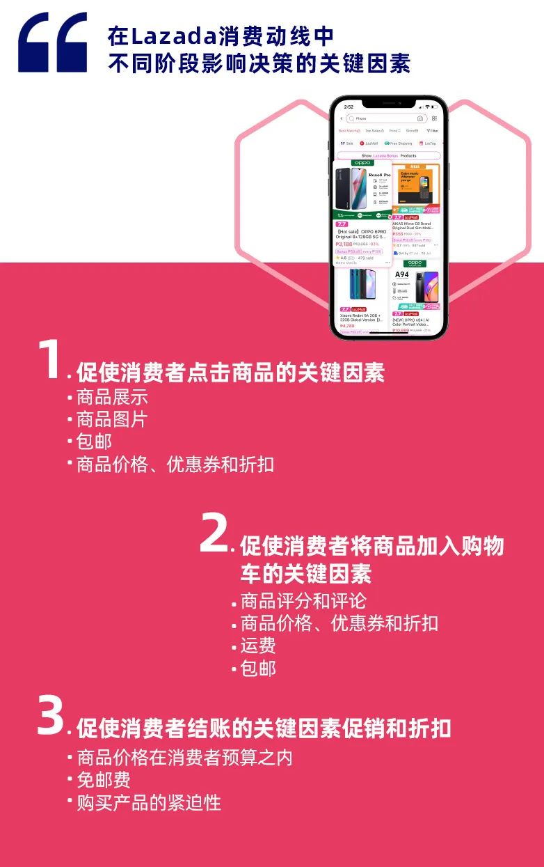消费者网购的行进动线,从点击到加入购物车再到结帐,期间有太多细节需要设置引导和消费刺激。但多数商家会因为人力、财力、时间的客观因素不能完全投入精力在各个环节。此时,分重点,划优先级的运营显得格外重要,在有限的资源里,把好钢都用在刀刃上,集中精力投资驱动消费的关键因素。 在用户的真实反馈中 什么才是驱动消费的关键因素? Lazada在东南亚消费者的调查中发现规律:首当其冲便是在上期内容所提及的包邮,无论是对于点击、加购亦或是最后的结账,明显的包邮提示和服务都举足轻重;对于新品牌和新上架的商品而言,获得商品评分和评论也尤为重要,有助于提高可信度,并引导消费者将商品添加到他们的在线购物车中;再者就是折扣和优惠,不完全是越低越好,有时限时限量的优惠销售再加上平台重点展示位,可以为店铺带来不可思议的销量。