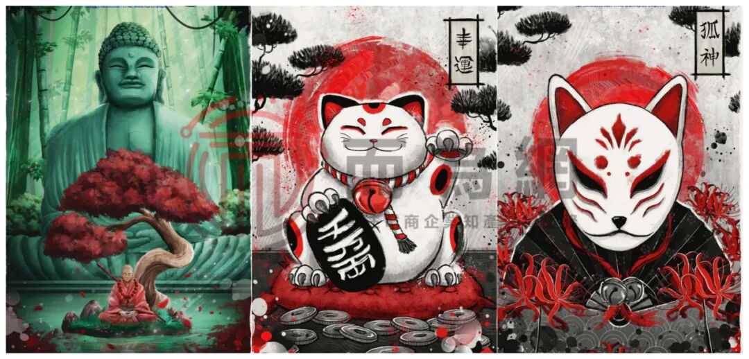 原告Stephanie Forbes是一位来自印度尼西亚的艺术家,擅长将现代数字技法与东方传统元素相融合。他的大部分作品都有亚洲元素,也受到日本美学与波普艺术的影响,作品涵盖日式狐神面具、持伞人物等多种元素。
