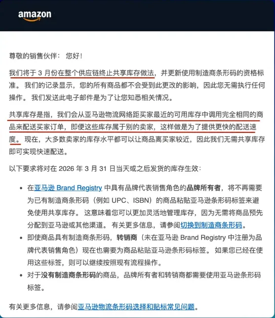 亚马逊近日向卖家发布通知,宣布自2026年3月31日起,将正式终止实施多年的“共享库存”模式,并更新使用制造商条形码的资格标准。