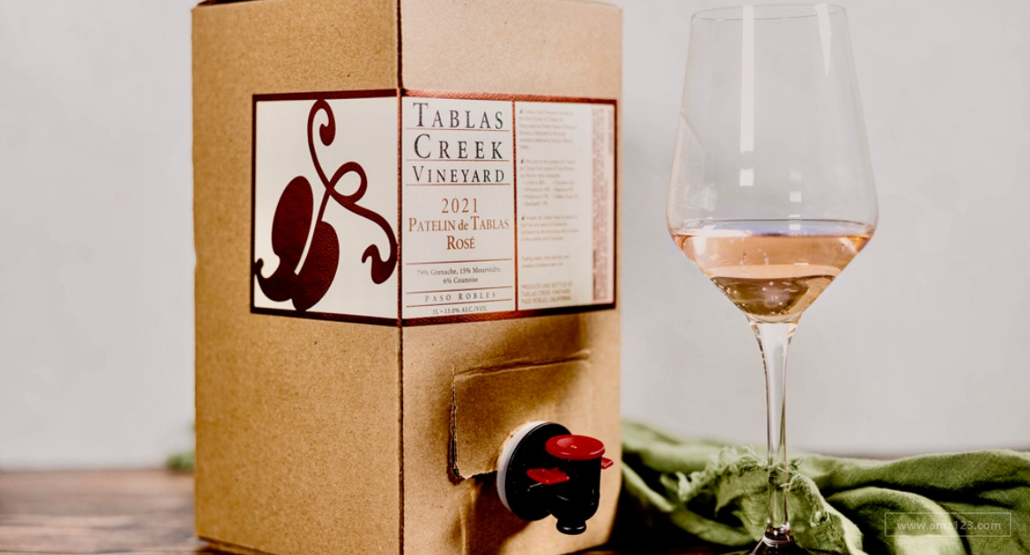 最近,塔湾酒庄(Tablas Creek )就将其桃红葡萄酒以纸盒形式进行包装,该纸盒是以牛皮纸为外包色,但韧性和硬度更佳,看起来奢华又显低调,在纸盒正面还带有一个接嘴可方便盛酒。与玻璃瓶相比,该包装的碳足迹显着降低 84%,同时还具有保存、储存和便携性方面的优势。