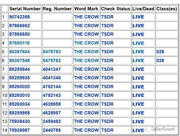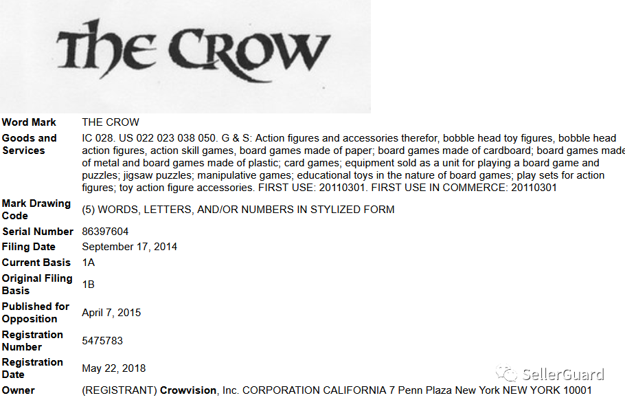 原告公司Crowvision, Inc持有The Crow文字商标,类别非常广泛,不能使用。