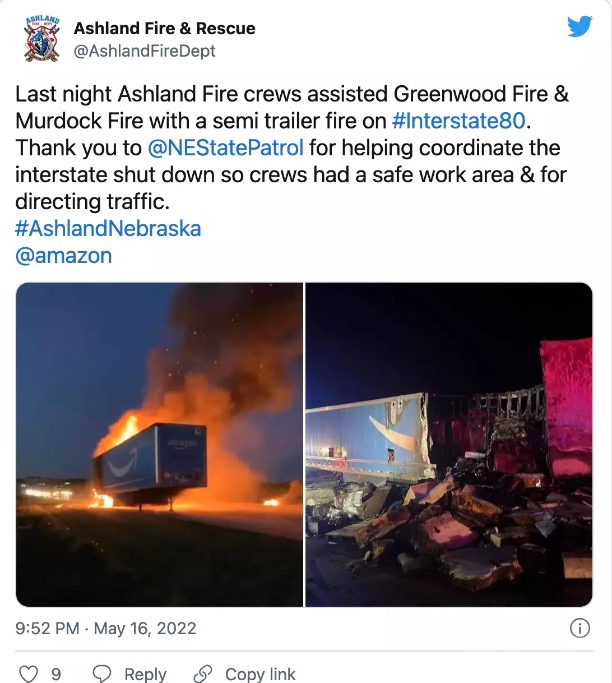 AMZ123获悉,5月16日,美国俄勒冈消防站发布推文,称一辆亚马逊半挂车在80号州际公路西行时突发起火,大量包括被烧毁。
