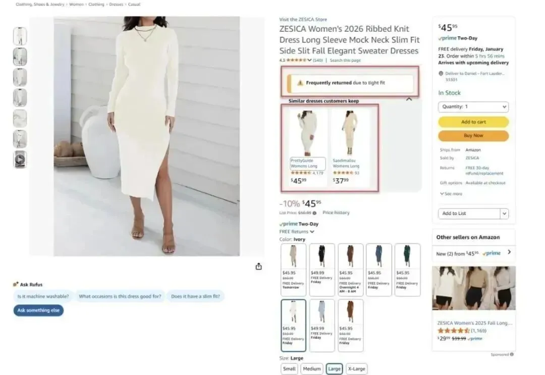 亚马逊新增的“Frequently Returned”高退货率标签,该标签以黄色感叹号标识在产品标题下方,直白标注退货原因(如尺寸过紧“tight fit”、质量问题等),下方还直接推荐相似竞品,相当于主动为对手引流。