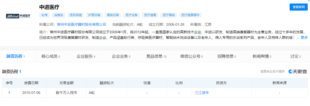 融资方面,根据天眼查信息显示,中进医疗成立至今共拿到了1轮融资。2015年7月6日由三江资本参与的A轮融资,融资金额为数千万人民币,具体数字暂未披露。