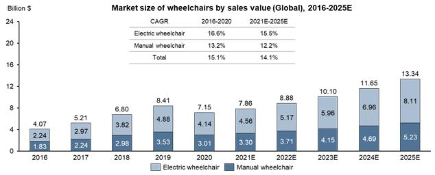 依据弗若斯特沙利文报告,2016 年至 2020 年,轮椅的总销售额从约 40.7 亿美元上升至约 71.5 亿美元,复合年增长率为 16.6%。预计到 2025 年底,轮椅的总销售额预计将达到约 133.4 亿美元,2021 年至 2025 年的复合年增长率为 14.1%。