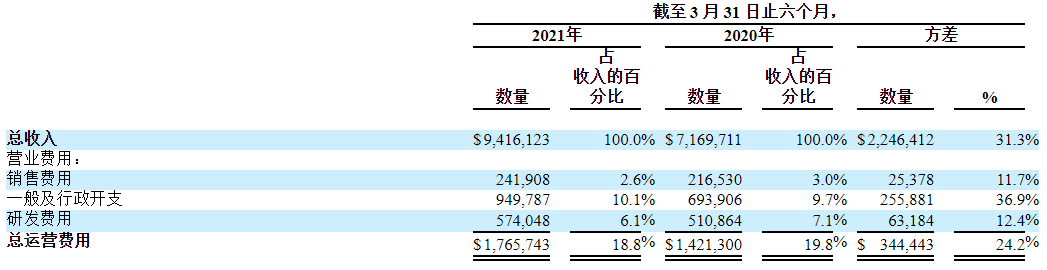 截至2021 年 3 月 31 日前6个月,中进医疗的一般行政费用为94.98万美元,占总收入10.1%,去年同期为69.39万美元,同比增长36.88%。中进医疗的行政费用要包括员工工资、福利和保险费用、坏账准备费用以及办公用品和公用事业等费用。