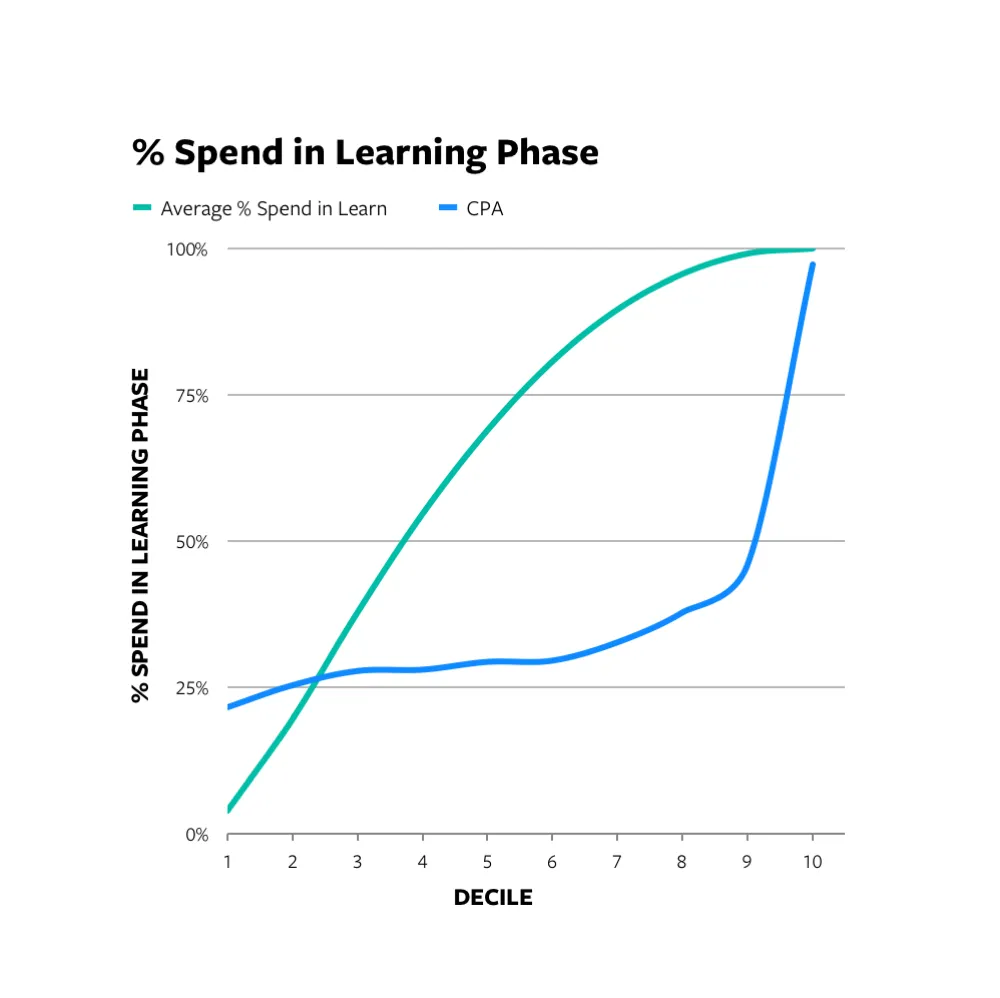 在学习阶段花费的预算份额越小,通常会导致用于稳定性能和较低CPA的预算份额越高。在学习阶段支出20%的广告主比在支出约80%的广告主看到的转化次数多17%,每次转化费用低15%。