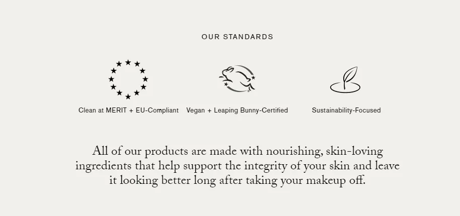 Merit的产品遵循EU、Vegan、Leaping Bunny等多重标准,明确排除硫酸盐、矿物油、甲醛释放物等常见争议成分,并强调“skin-loving ingredients”。这种配方策略能够在保证妆效的同时,降低皮肤负担,提升卸妆后的舒适度,也更有助于建立长期信任与复购。