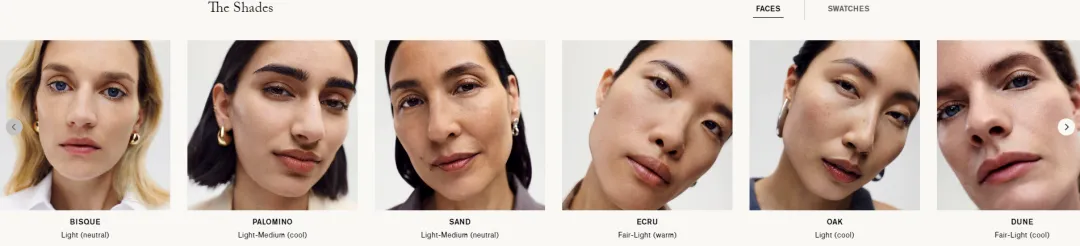 Merit在产品详情页中展示不同肤色、族裔、年龄用户的上脸效果,让消费者能轻松找到相似的对照对象。这种高度可视化的内容,是能够减少色号不匹配的风险,降低决策成本,从而显著提升转化率与满意度的。