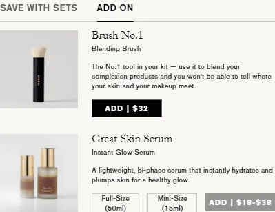 Merit在产品详情页加入了关联性极强的加购推荐模块,如底妆配刷具、修容配高光等,这类推荐不是“随便推荐”,而是基于实际使用场景的“即买即用”组合。因此其是能够降低用户决策压力,同时提高客单价的。