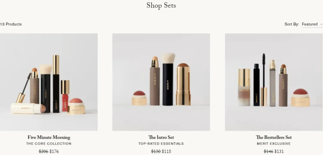 大多数消费者都会关注性价比,同时也有部分消费者不愿花时间逐一挑选每个产品,Merit提供多种高频使用组合的套装,并以更优惠的价格打包出售,这不仅减少了选择成本,还通过使用场景命名(如五分钟晨妆、入门套装),让消费者感觉这套产品就是“为我准备的”。