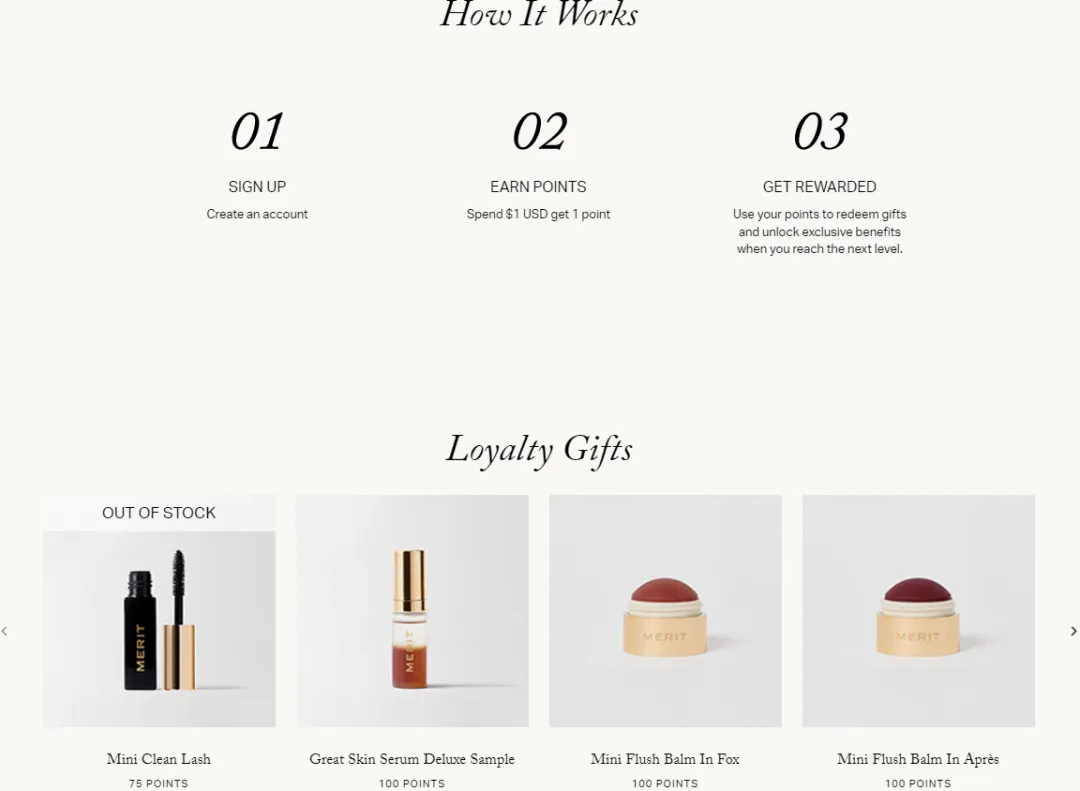 Merit构建了完善的忠诚度体系,包括积分机制、积分礼品、会员等级与对应福利,以及更高层级的专属服务。这种体系让消费者在下单当下就能获得“未来收益”的感知,从而提升即时转化,并增强复购率与客户终身价值。