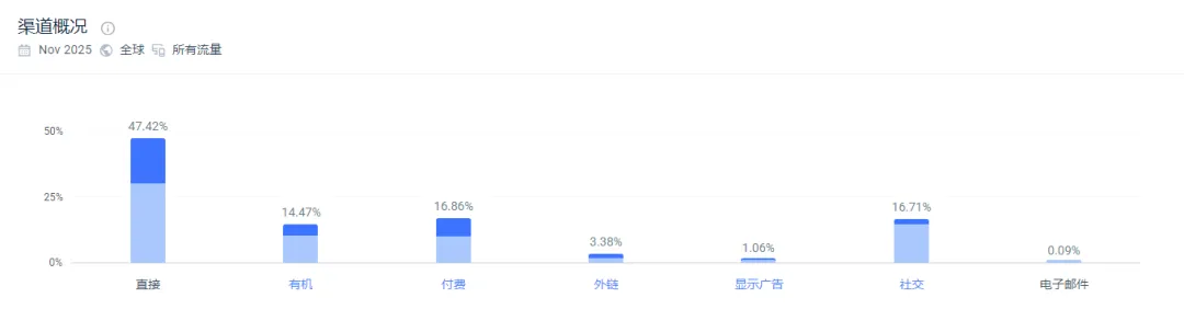 根据similarweb数据显示,Merit官网的流量主要来自于直接访问流量(47.42%)、付费广告(18.86%)、社交媒体(16.71%)、自然搜索流量(14.47%)。