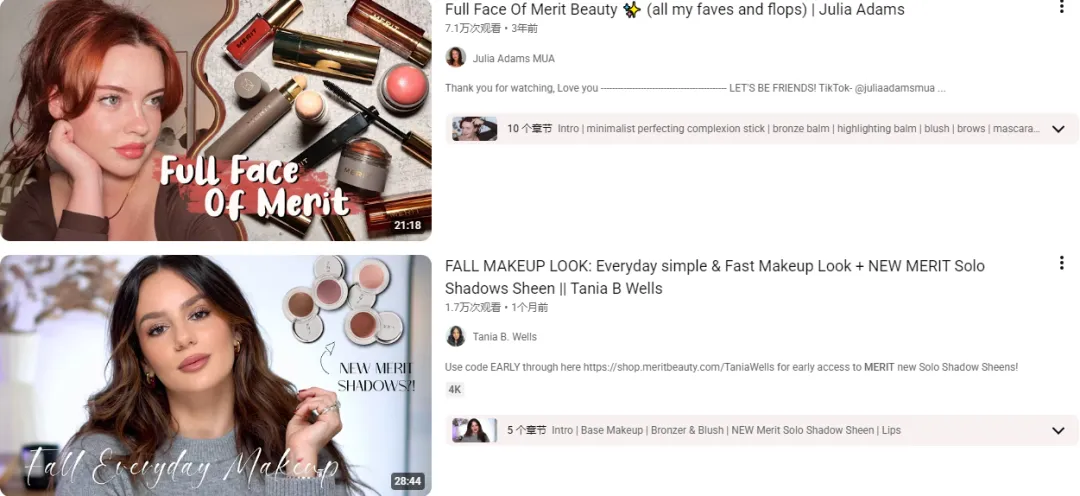 Merit在红人营销上并没有全力押注头部,而是选择覆盖多类型美妆博主:既包括年轻、有粉丝基础的红人,也包括粉丝不多但影响力深、可信度强的小众创作者。这些创作者更擅长呈现“真实妆感+日常适用”的内容,比传统广告更贴近用户的日常决策场景,自然也更容易建立信任。