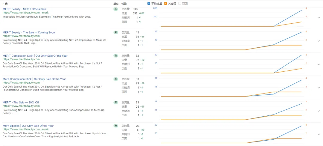 付费广告:根据ahrefs数据,我们会发现Merit的广告策略呈现出非常鲜明的特征:强节奏、强单品、强转化路径。Merit的广告集中围绕年度大促节点密集投放,多条标题反复强调“20%off”、“free gift with purchase”等强刺激内容,目的非常明确——在促销期间快速收割高意向流量。