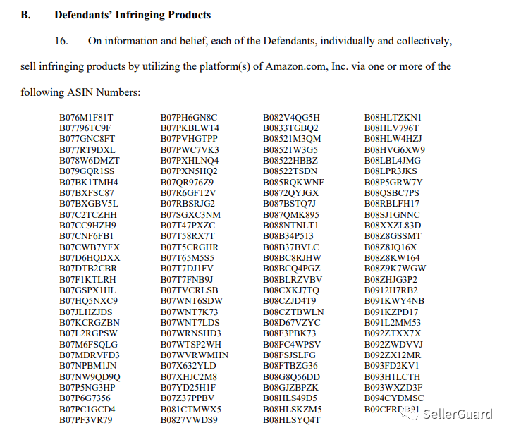 以下为诉状公布的亚马逊被告侵权链接ASIN号名单: